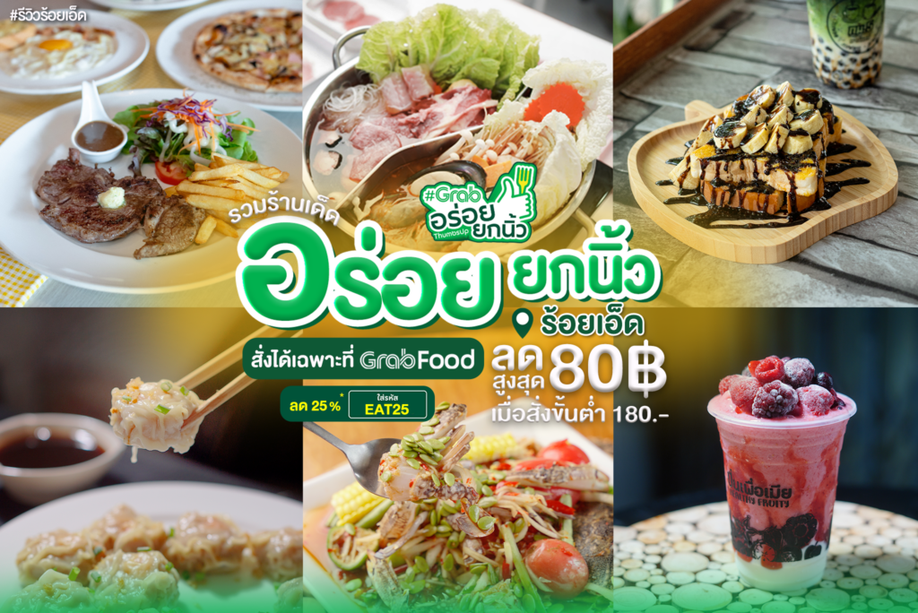 รวมร้านยอดฮิต การันตีความอร่อย โปรโมชั่นสุดปังลดสูงสุดถึง 80 บาท เมื่อสั่งขั้นต่ำ 180 บาท 🥞 พร้อมโค้ดส่วนลด 25%* เมื่อซื้ออาหารกับร้านค้าอร่อยยกนิ้ว ผ่าน Grabfood เพียงใส่รหัส “EAT25” #สั่งได้ที่GrabFoodเท่านั้น😍